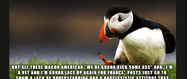 Militaristinen, maskuliininen kuvapolitiikka Imgurissa keskittyy uhoamiseen, jossa terroristeille suunnataan kuvia tosimiehistä, jotka ovat sodankäynnin ammattilaisia ja väsymättömiä sotureita. Rukoilu ei ole tarpeen, kun Ranskaa suojelevat aseistautuneet sotilaat, mukaan lukien liittoutuneiden maiden parhaimmisto. ”Nämä jätkät eivät ole mitään patonginmussuttajia”.