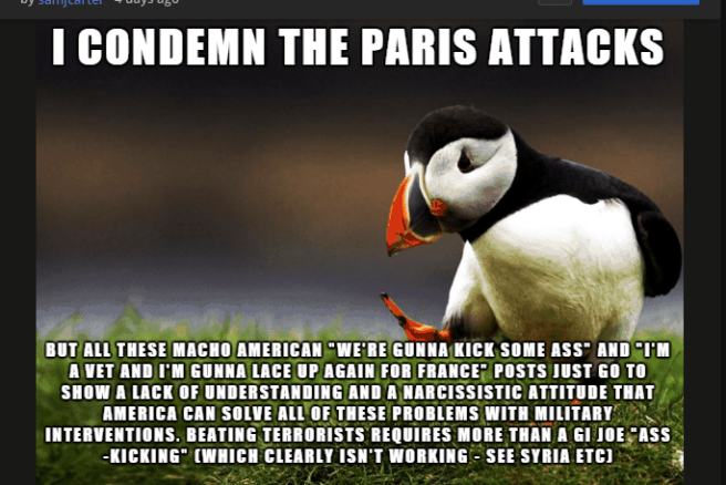 Imgurista löytyy visuaalista jakamisen politiikkaa silmänkantamattomiin. Tein analyysin siitä, millaisia politiikkavaihtoehtoja kuvat tarjoavat Pariisin iskuihin noin kolmen päivän aikana heti iskujen jälkeen.