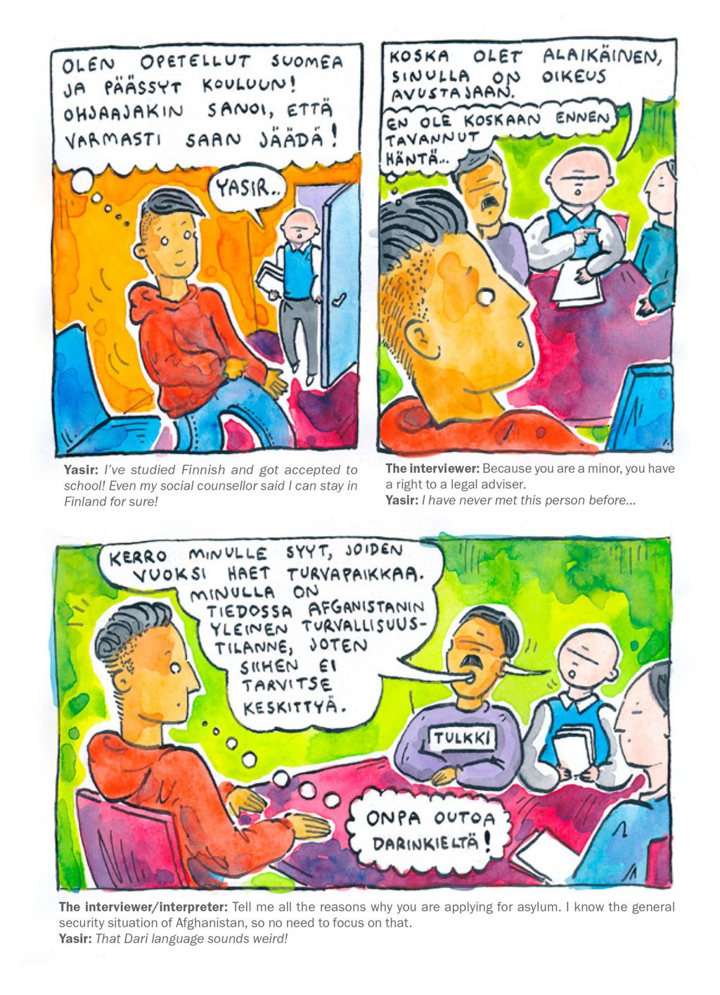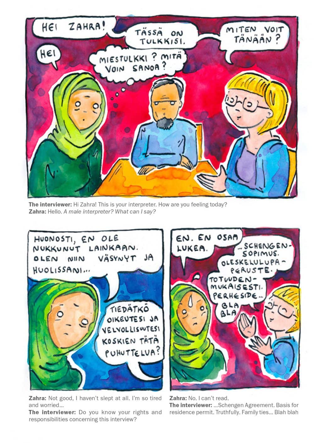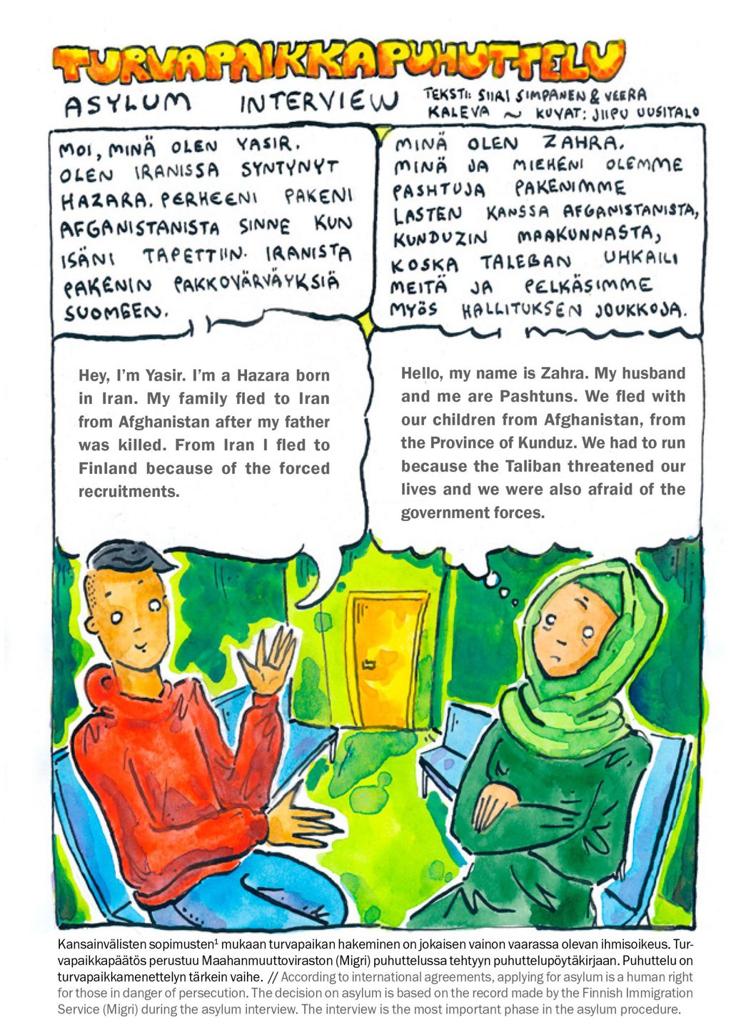 Lakimuutokset sekä Maahanmuuttoviraston kiristyneet tulkintalinjat ovat heikentäneet turvapaikanhakijoiden oikeusturvaa ja korostaneet vapaaehtoisverkostojen merkitystä. Esimerkki heikentyneestä turvapaikkamenettelystä ovat puhuttelut, joihin oikeusavun kaventaminen on vaikuttanut merkittävästi. Näiden ongelmien esiintuomiseksi syntyi Turvapaikkapuhuttelu -sarjakuva.