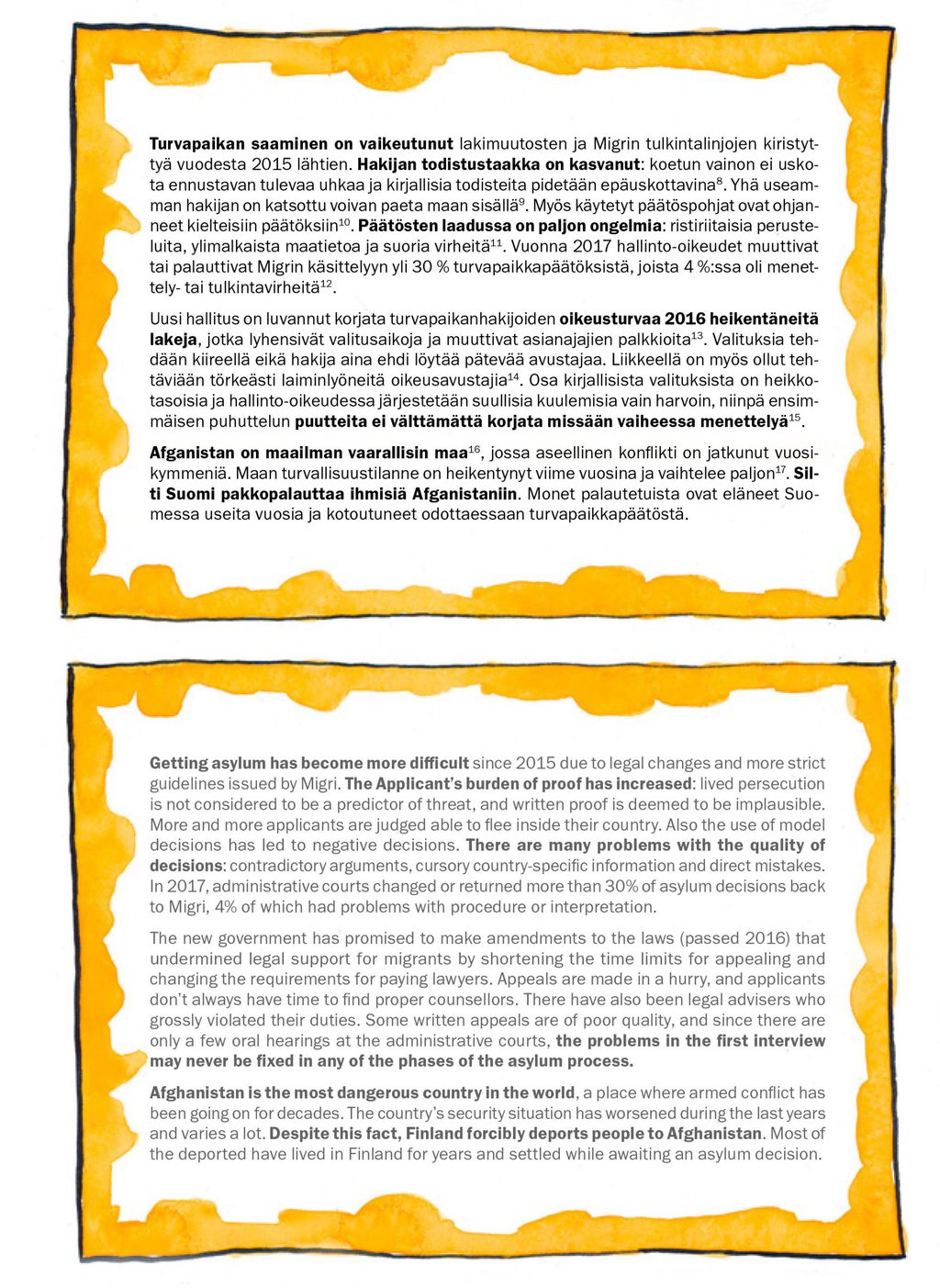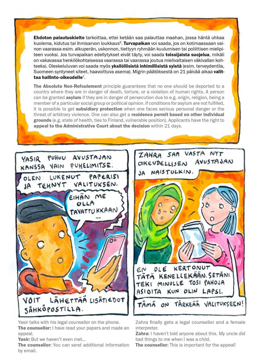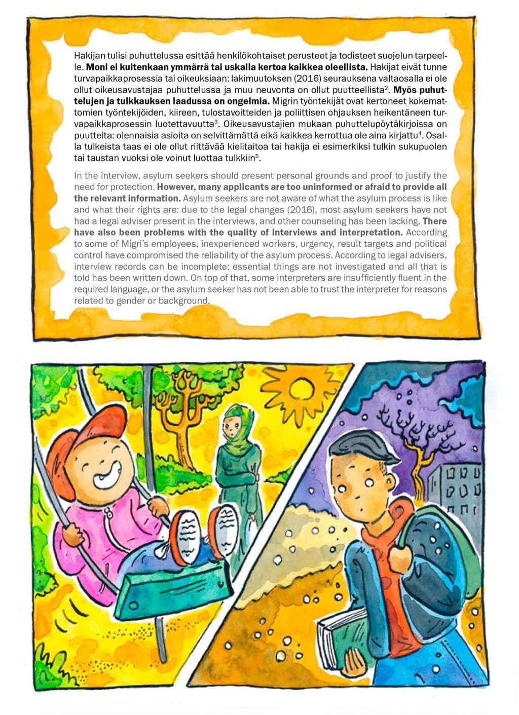Lakimuutokset sekä Maahanmuuttoviraston kiristyneet tulkintalinjat ovat heikentäneet turvapaikanhakijoiden oikeusturvaa ja korostaneet vapaaehtoisverkostojen merkitystä. Esimerkki heikentyneestä turvapaikkamenettelystä ovat puhuttelut, joihin oikeusavun kaventaminen on vaikuttanut merkittävästi. Näiden ongelmien esiintuomiseksi syntyi Turvapaikkapuhuttelu -sarjakuva.