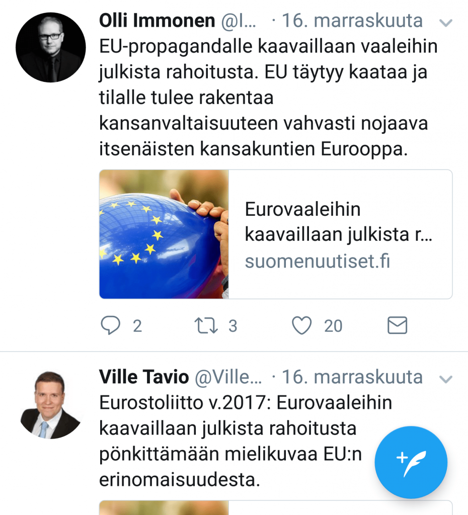 Siinä missä NL:ssa toisinajattelijat pääsivät hengestään tai päätyivät ainakin Siperiaan tai mielisairaalaan, Suomen ja Euroopan nykymenoon muutosta saarnaavan äärioikeiston ”toisinajattelijoiden” palkka tulee Suomen valtiolta ja EU:lta ja vieläpä ihan hyvä sellainen 🙂 https://www.kauppalehti.fi/uutiset/raha-pitaa-halla-ahon-brysselissa/80e3e3f7-f8b6-3c1f-a18a-ac5b26488349 ja https://yle.fi/uutiset/3-10066031