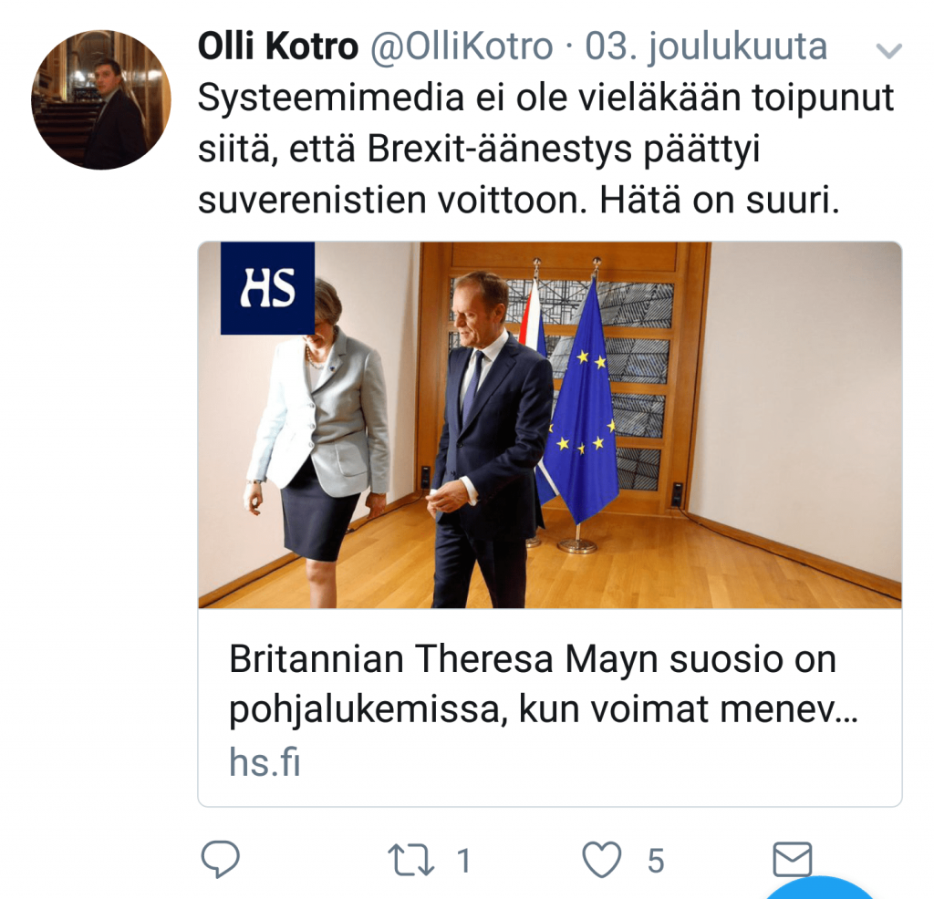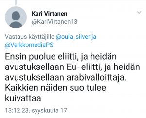 Erään heistä mukaan Suomen on vienyt ”[e]nsin puolue eliitti, ja heidän avustuksellaan Eu- eliitti, ja heidän avustuksellaan arabivalloittaja. Kaikkien näiden suo tulee kuivattaa”.
