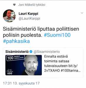 Kohta nämä lait muutetaan, oikeusministeriö ja sisäministeriö persuille niin se alkaa, kuin 30-luvulla. Tuomarinimitykset tulee seuraavaksi, sitä ennen tuomareita aletaan maalittamaan, kukaan ei hae oikeuden tuomariksi, paitsi persun oma mies tai nainen jne. Nyt pitää olla hereillä. Nimittäinpersut eivät nuku, he ovat liikkeellä.