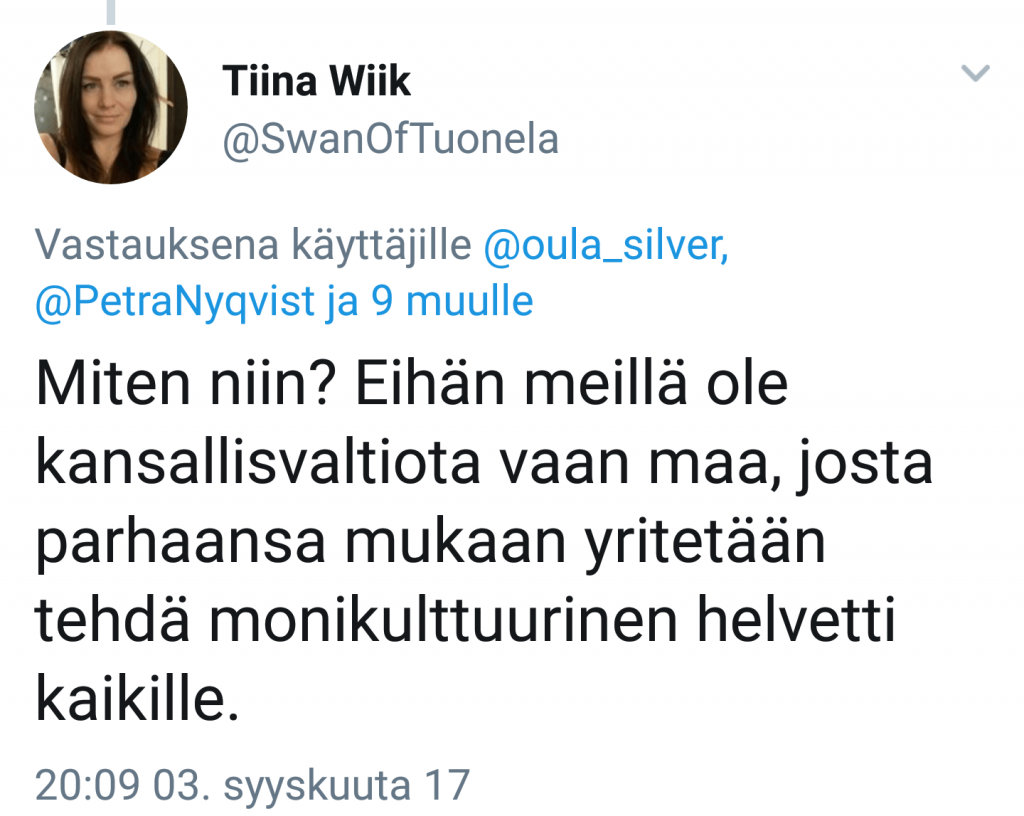 Perussuomalaisten sisällä vaikuttava fasistinen Suomen Sisu -järjestö on nähnyt juuri tästä syystä vaivaa laatiakseen pitkän ja polveilevan ”suomalaisuuden” määritelmän. Määritelmä on manifesti siitä, kuka kansakuntaan voi kuulua ja kuka ei, ja samalla sisulaisten pelkojen kuvaus ja luettelo.